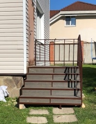 VIP-предложение Сварной металлокаркас крыльца и лестницы может выдержать любую нагрузку, он прочен и надежен. Ступени лестницы и покрытие самого крыльца может быть выполнено по желанию заказчика из металла, террасной доски, дерева. Перила могут быть простые или содержать элементы ковки. Все детали обговариваются индивидуально с заказчиком. Стоимость одной ступени с ДПК размером 1000 х 340 мм - 3821 руб.