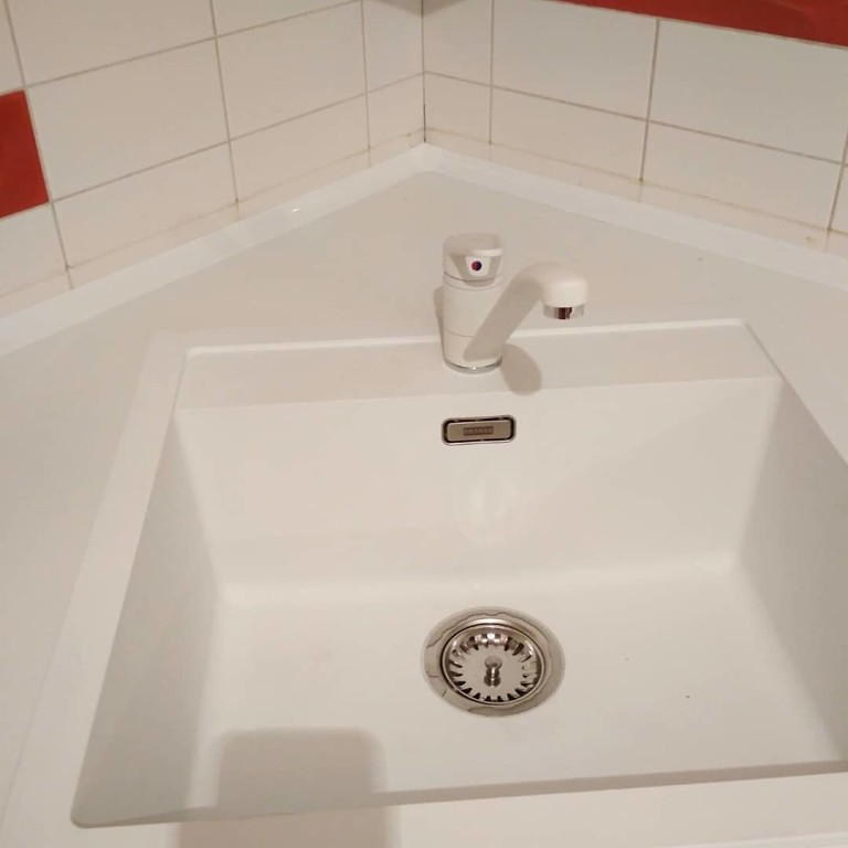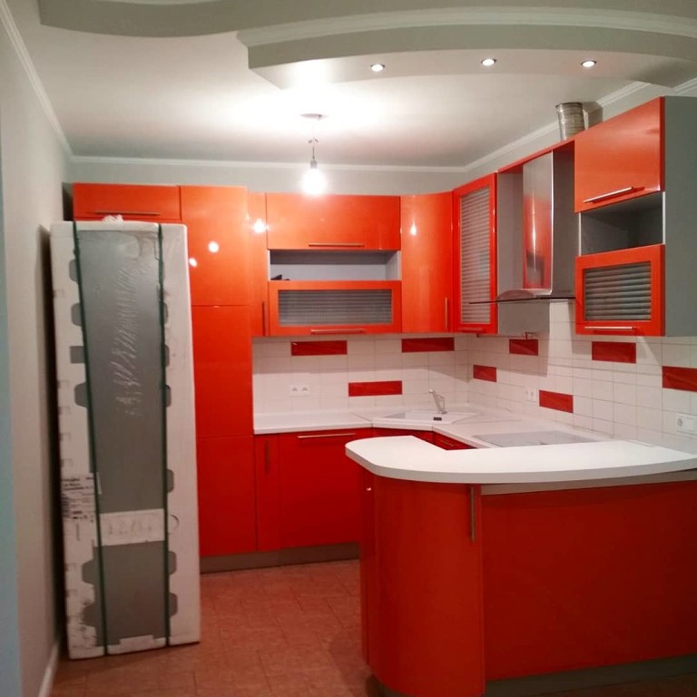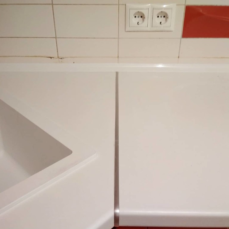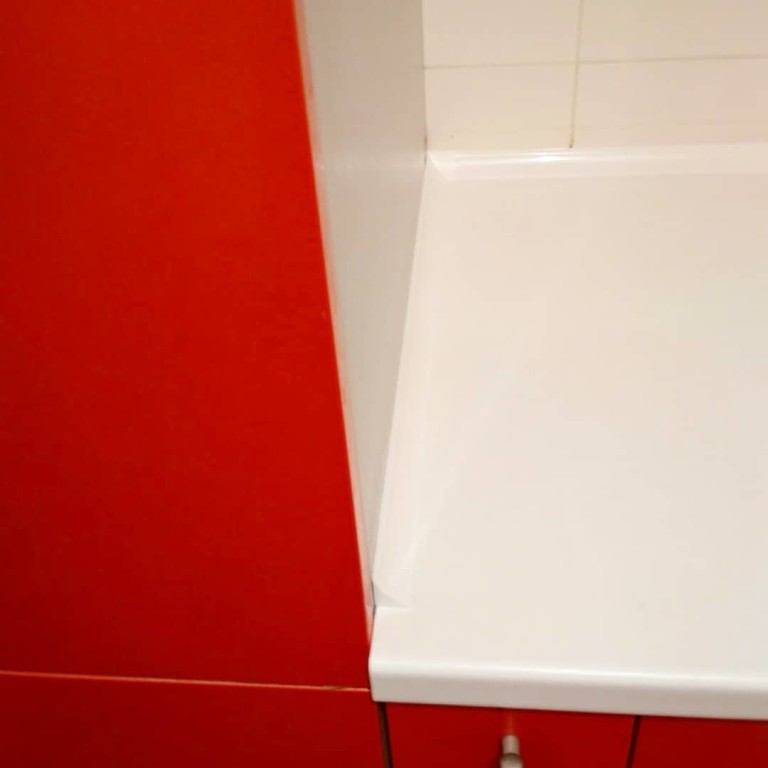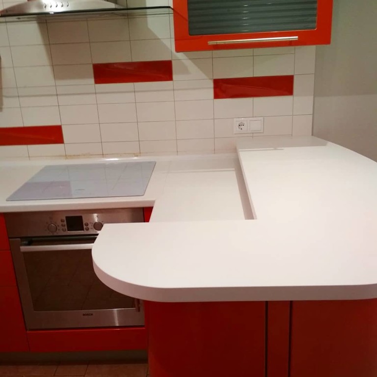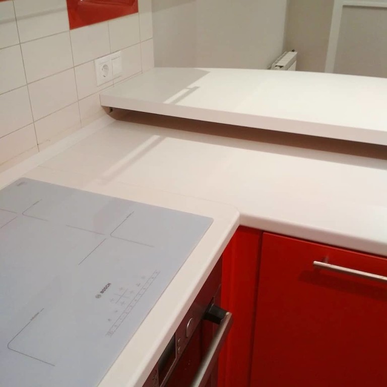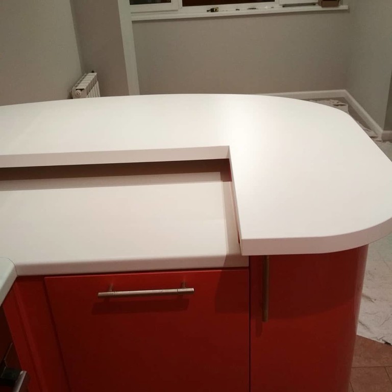 Столешница с барной стойкой, распиловка и монтаж, еврозапил, трапеция, плинтус. Wilsonart D354-01 белый глянец.