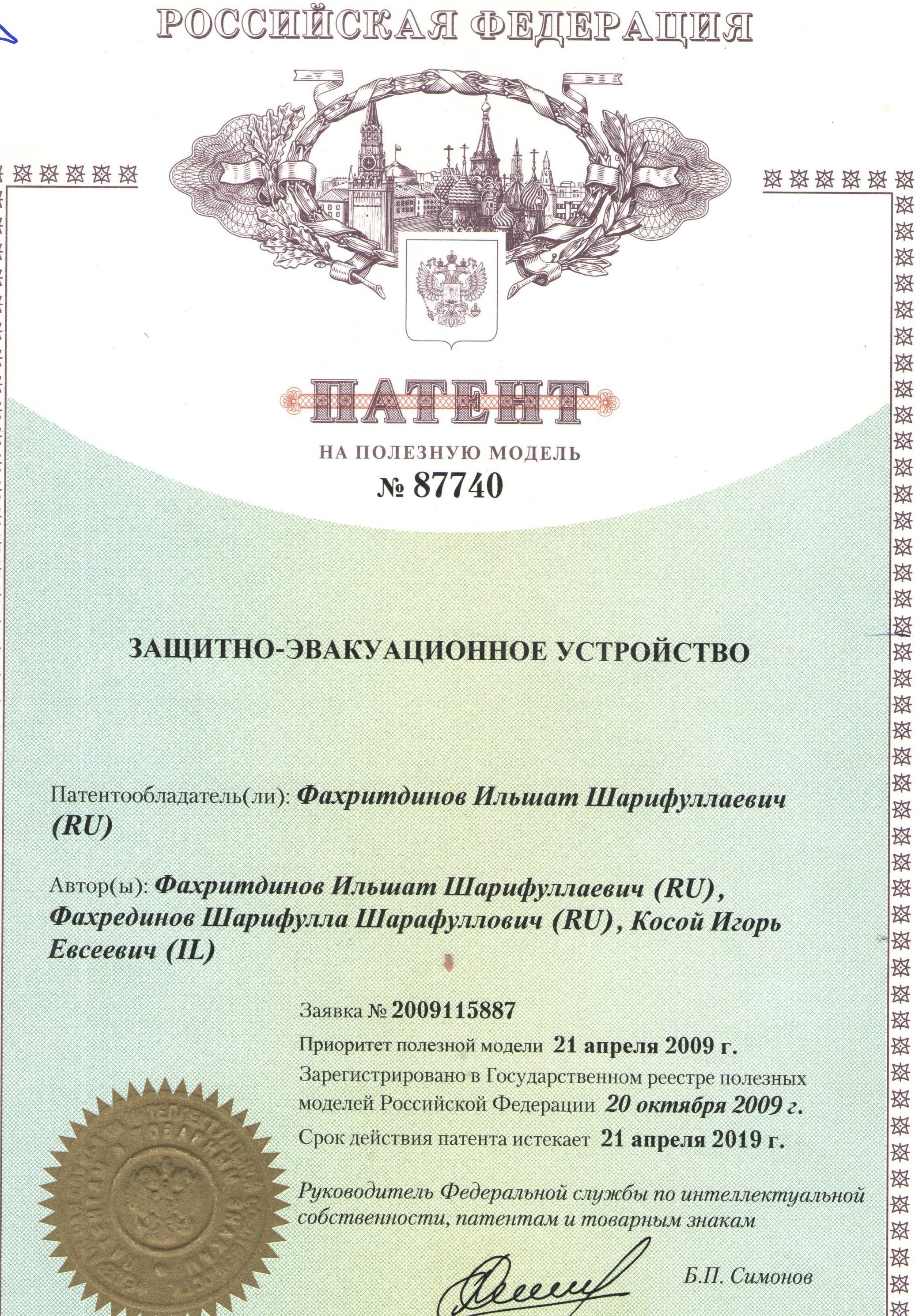 Ищем российских производителей металлических дверей и металлоконструкции для работы на взаимовыгодных условиях Здравствуйте ! К Вам обращается житель города Стерлитамак Республики Башкортостан Фахрединов Шарифулла Шарафуллович! Я являюсь патентообладателем патента полезной модели на Защитно-эвакуационное устройство. Дело в… Читать дальше том что я совместно с соавтором патента Махмутовым Ильшатом Мидхатовичем запатентовали новое Защитно-эвакуационное устройство. Защитно-эвакуационное устройство -это металлические двери,оконные и дверные решетки, аварийные выходы c функцией Защитно-эвакуационного устройства. Номер патента 190301. Данное устройство не имеет аналогов в России. Данное устройство обеспечивает: 1. Отсутствие доступа в помещение снаружи для посторонних лиц 2. Не требует открывания ключами 3. Открывание решеток и дверей при пожаре за 1 секунду 4. Автоматическое открывание решеток от пожарной сигнализаций 5. Открывание с пульта охраны 6. В отсутствии электроэнергии, возможность срабатывания от автономного питания 7. Открывание решеток и дверей механически внутри помещения 8. Открывание при повышений предельно допустимой концентраций радиации 9. Автоматическое, экстренное открывание решеток и дверей при наличии вредных для организма примесей и газов в помещений 10. Открывание решеток и дверей с помощью мобильной связи с последующим извещением о состояний (открыто, закрыто) 11. Открывание решеток и дверей с помощью пульта автомобильной сигнализаций 12. Комбинаций выше перечисленных способов В состоянии покоя Защитно-эвакуационное устройство не потребляет электроэнергию и остается закрытым Защитно-эвакуационное устройство имеет также преимущества в отличие от устройств антипаники: 1. Простота конструкции 2 Отсутствие импортных деталей 3 Низкая стоимость изготовления 4 Исключает несанкционированное проникновение посторонних лиц Простота конструкций, отсутствие мелких доборных элементов (пружин и тп), технологичность в производстве, обуславливают низкую себестоимость и высокую степень надежности работы устройства. Механизм Защитно-эвакуационного устройства, является трансформером, поэтому может быть адаптирован к любым видам вертикальных дверей и решеток независимо от габаритных размеров и материала исполнения последних. Предел конструктивных решений, не исполняющих принцип работы механизма для изготовления Защитно-эвакуационного устройства не определен, поэтому зависит только творческих и технологических возможностей специалистов конкретного предприятия-изготовителя Данное устройство можно адаптировать к подъездным дверям, работающим через домофон Преимущества 1. В отличие от существующих подъездных дверей, данное устройство почти не потребляет электроэнергию 2. При отключений электроэнергии, существующие двери остаются открытыми. При данном механизме, двери закрыты 3. При использовании данного механизма, при закрытом состояний — нет электрического тока на замке дверей. Также мы подали заявку на выдачу патента на полезную модель-Устройство для удаления сосулек. Данное устройство удаляет сосульки с козырьков крыш здании и сооружении. На данную заявку пришло от фипса положительный результат экспертизы по существу. Мы хотим рассмотреть возможность работать с Вами по нашим разработк