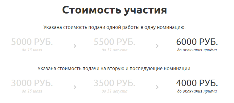 Стоимость участия Стоимость подачи работ в спонсорские номинации указаны рядом с каждой из номинаций. Подача работ в номинацию «Сайт благотворительной организации» бесплатна. Стоимость подачи работ в основные и золотые номинации будет увеличена дважды: 15 июля и 1 сентября. Стоимость подачи первой рабо… Читать дальшеты на конкурс (основная номинация): 5 000 рублей с повышением до 5 500 рублей с 16 июля, до 6 000 рублей с 1 сентября. Стоимость подачи второй и последующих работ (основная номинация): 3 000 рублей с повышением до 3 500 рублей с 16 июля, до 4 000 рублей с 1 сентября. Стоимость подачи каждой работы в каждую из «Золотых номинаций»: 2 000 рублей с повышением до 2 500 рублей с 16 июля, до 3 000 рублей с 1 сентября.