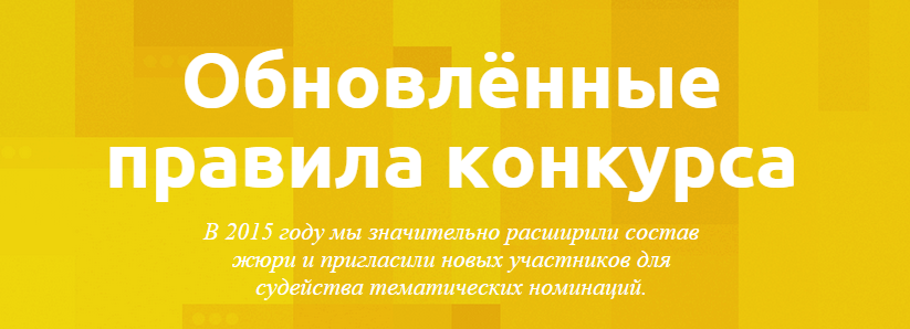 Подача работ и номинации Чтобы подать сайт на конкурс (до 20 сентября 2015 года): Авторизуйтесь через сервис Runet-ID на сайте. Проследите, чтобы профиль в Runet-ID содержал название компании, которая будет оплачивать участие сайта в конкурсе. Добавьте заявки (сайты): внимательно заполните все поля и… Читать дальше прочитайте пояснения к ним. Заполните поле «URL разработчика», если вы подаёте работу как разработчик и планируете участвовать в номинации «Лучший веб-разработчик» (см. далее). Обратите внимание на поле «Регион». В нём нужно выбрать регион, где работает проект. Тогда сайт будет участвовать в розыгрыше региональных номинаций (см. далее). Учтите, что здесь указывается регион работы проекта, а не регион разработчика! Сформируйте счёт и оплатите его. Вы сможете самостоятельно отредактировать описание заявок (описание сайта, картинка для номинации, дополнительные поля) до 20 сентября 2015 года. Сайт может быть подан в любое количество основных номинаций, но мы рекомендуем выбирать наиболее подходящие, так как соответствие сайта тематике будет одним из параметров оценки. Если при подаче сайта выбрана хотя бы одна основная номинация, вы можете добавлять его в любое количество «Золотых номинаций» — «Лучший дизайн», «Лучший usability / UX», и так далее. Решением жюри также будут определены победители в трех номинациях, которые нельзя выбрать самостоятельно: Лучший веб-разработчик Самое неожиданное решение Гран-при На каждый из этих трех призов может претендовать любой проект, поданный на конкурс, потому что жюри выбирает из абсолютно всех конкурсных проектов. Также будут разыграны статуэтки «Золотого кибермастера» за лучшие сайты по федеральным округам РФ. Лучшие сайты по федеральным округам определяются по региональной привязке сайта, которую конкурсанты указывают при подаче работ.